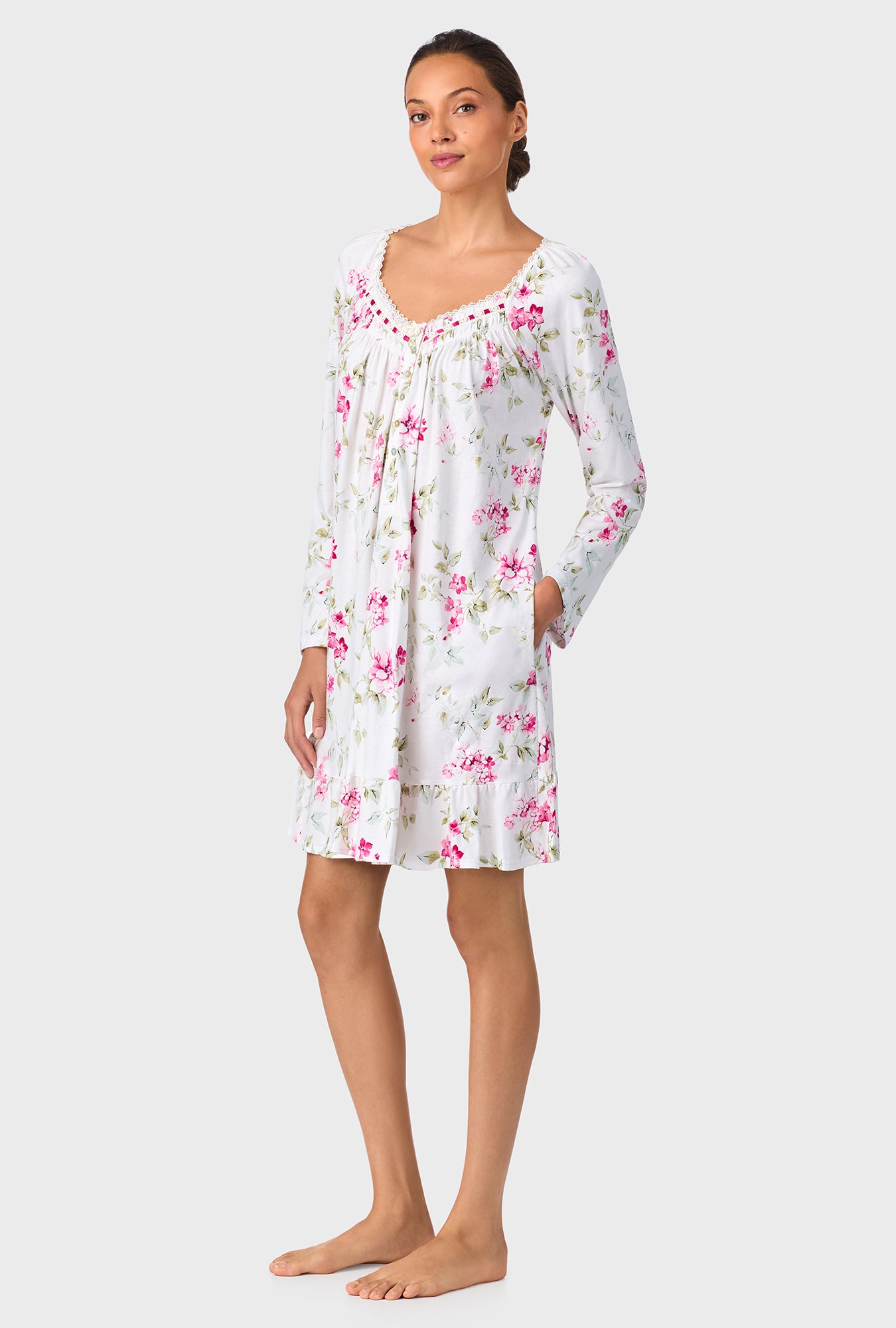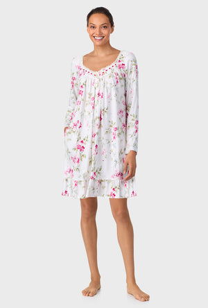 This 100% cotton long sleeve short nightshirt features an edge lace-trimmed sweetheart neckline. Ribbon beaded floral lace, a satin bow and smocking details embellish the front yoke. It's finished with an Akoya shell button placket and a ruffled hemline.