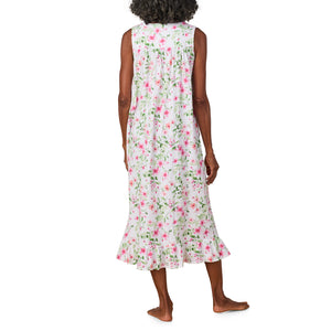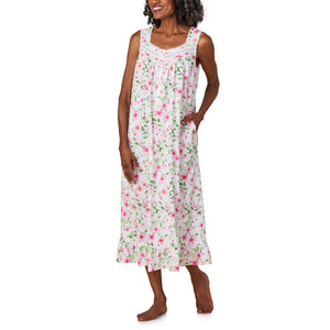 Our 100% cotton sleeveless nightgown in a floral print is perfect for relaxed nights. The square V-neck with lace and pintuck accents, side seam pockets, and ruffle hem create an effortlessly elegant silhouette.